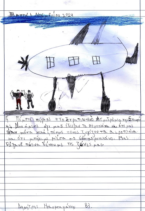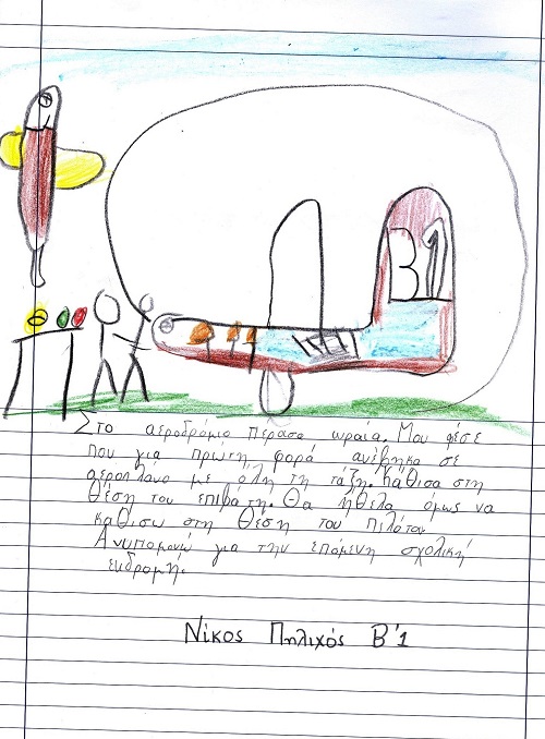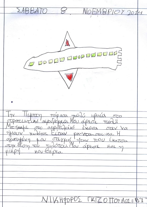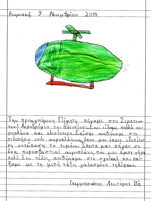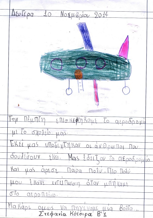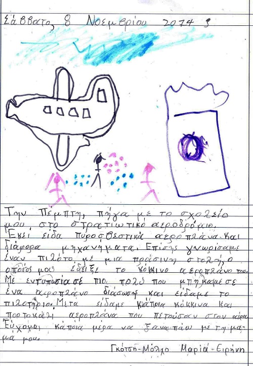 Με αφορμή τον εορτασμό της Πολεμικής Αεροπορίας, οι μαθητές της Β΄ Δημοτικού επισκέφθηκαν το Στρατιωτικό Αεροδρόμιο Ελευσίνας κι έγραψαν στα ημερολόγιά τους τις εντυπώσεις τους.
