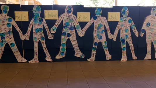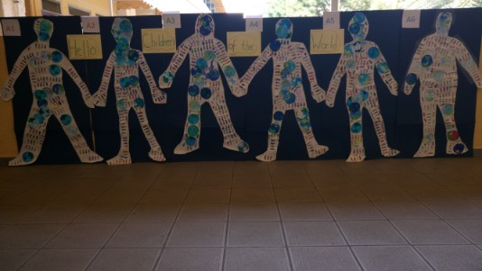 Each group drew around a student and filled the body shape with drawings of children from different countries of the world. The project was accompanied by the song “Hello to all the Children of the World” that our students learnt from a video produced by Japanese students.