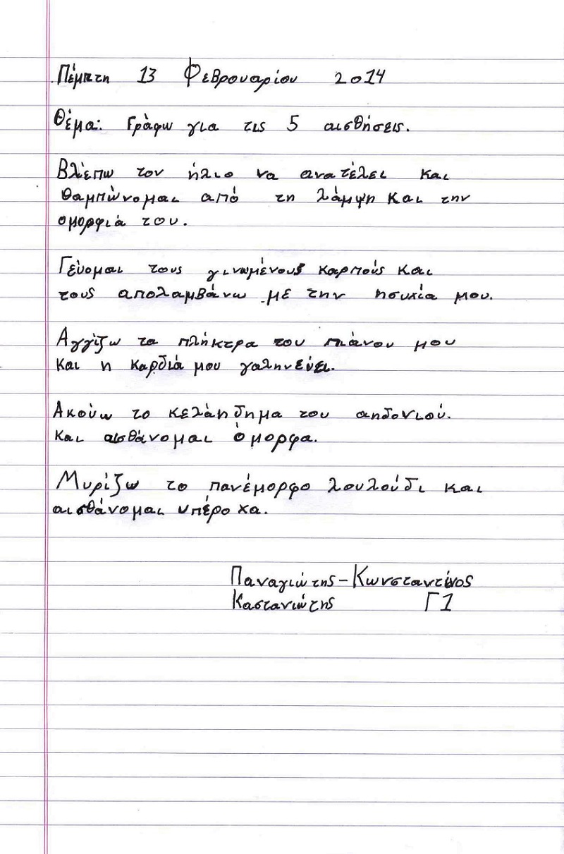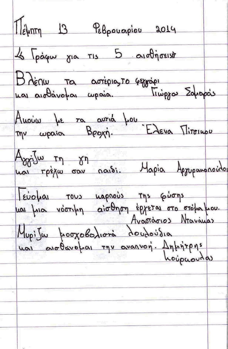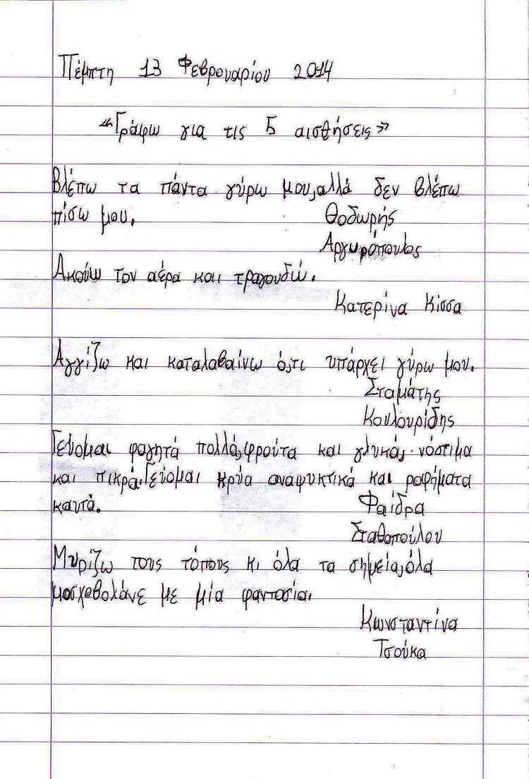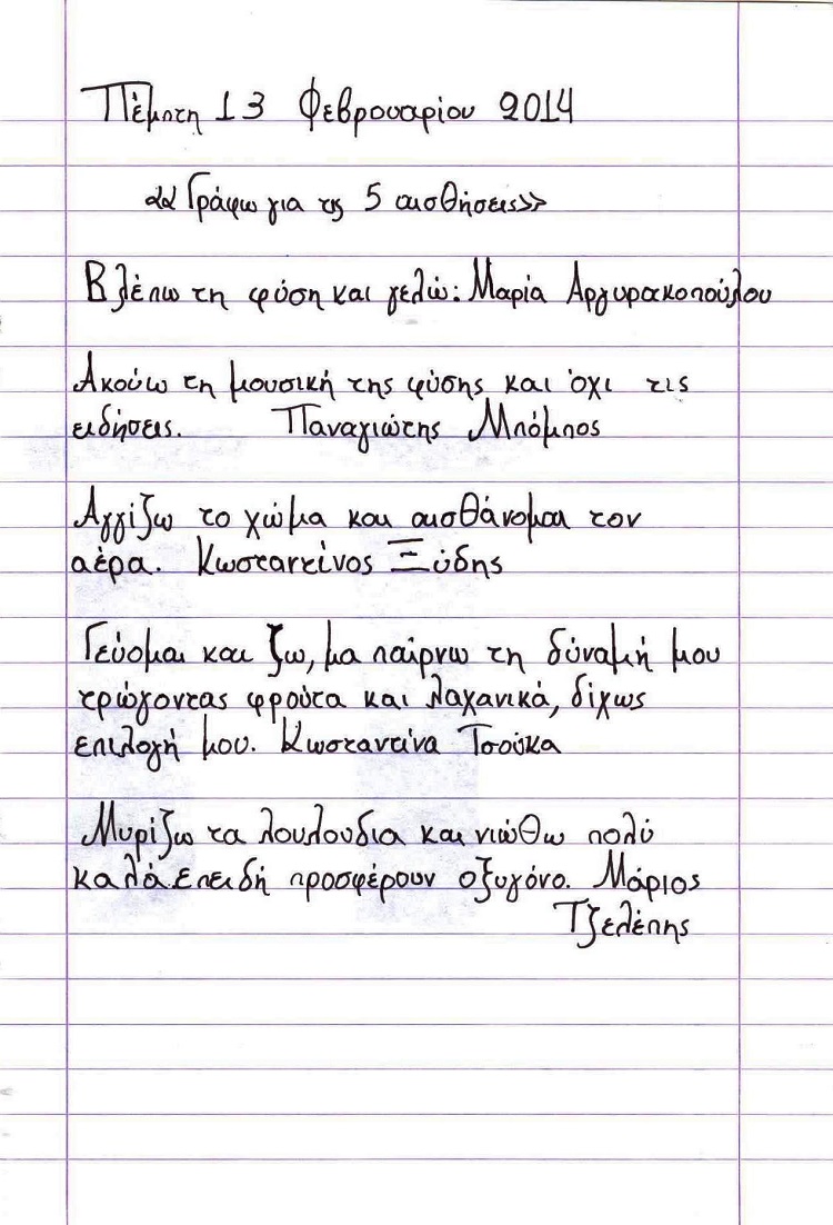 Στο project«Αποδέχομαι τον Άλλο» μάθαμε να αποδεχόμαστε τη διαφορετικότητα, ακολουθώντας διαφορετικά μονοπάτια… Ένα από αυτά ήταν οι αισθήσεις και πώς η μία μπορεί να αναπληρώσει την άλλη και γράψαμε ποιήματα για αυτές.